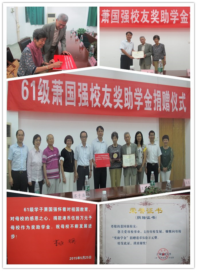 2015年5月25日下午,61级香港校友萧国强伉俪向母校奖助学金捐款港币50万元。