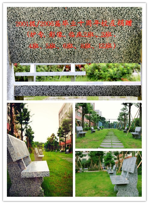 2017年6月,2001级&2006届校友为纪念毕业十周年向母校捐赠28张石椅。广州医科大学,承载了我们最美的青春记忆;我们也见证了母校高速的发展。这批爱心石椅分布在广州医科大学番禺校区学生生活区,不仅为学生增加了读书和休闲之地,同时也体现了广医学子对母校的感恩情怀。