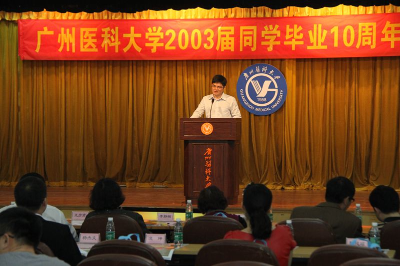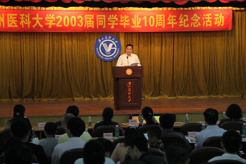王彦贤副校长在讲话中,对2003届校友毕业十周年纪念活动表示祝贺,他简要介绍了学校近年来的发展情况,近10年来,学校在教学、科研、学位学科建设、医疗服务和校园面貌取得的巨大发展,并在今年成功更名为广州医科大学,实现了55年来,几代广医人的梦想。他勉励校友要倍加珍惜同学情谊,时刻不忘母校的嘱托和期望,在工作学习生活中取得更大的成绩,为促进学校发展多做贡献。最后,他强调指出,广医是校友永远的家,无论大家走到哪里,遇到什么困难,母校都会给予最大的支持和帮助。他还向校友们发出了热情邀请希望校友们多与学校联系,常回母校看看。