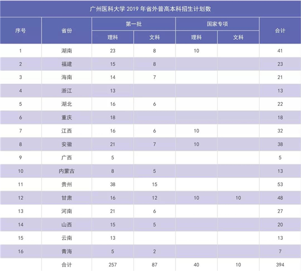 广州医科大学2019年省外普高本科招生计划数