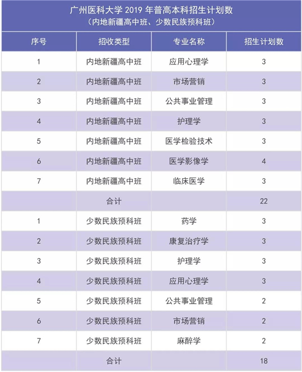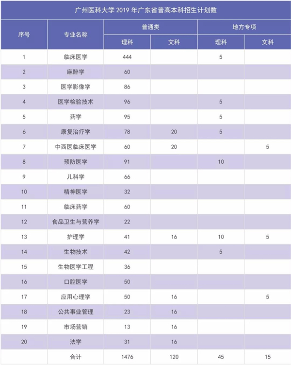 广州医科大学2019年广东省普高本科招生计划数