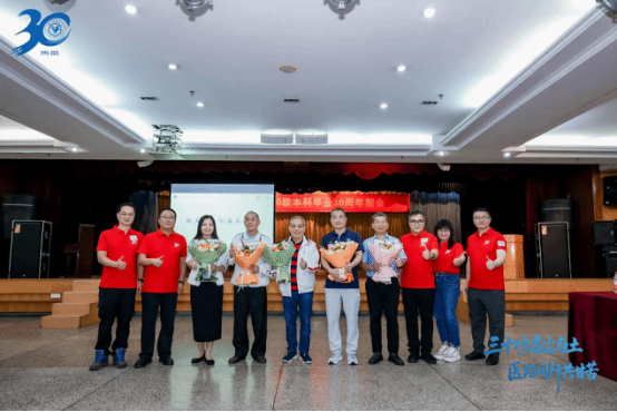 校友代表向母校和老师献花 此次座谈会不仅是一次青春的回顾,更是广医精神的传承与延续。三十载风雨不改同窗谊,万千言语难尽师生情。愿所有广医人携手同行,在各自的岗位上继续发光发热,为母校增添新的荣光! 座谈会结束后,全体参会人员移步至体育馆门口拍摄“全家福”,定格这跨越三十年的重逢时刻。