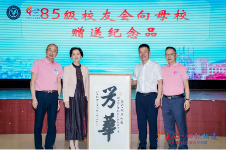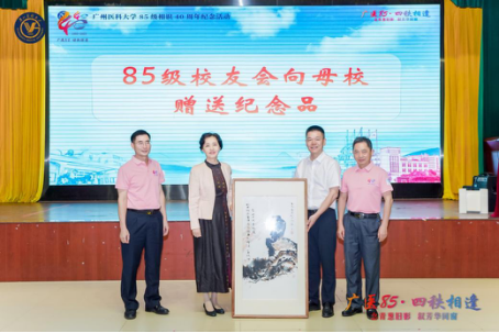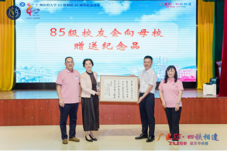 85级校友代表向学校赠送校友作品 此次相聚不仅是一次青春的回顾,更是广医精神的传承与延续。四十年风雨不改同窗谊,万千言语难尽师生情。愿所有广医人携手同行,在各自的岗位上继续发光发热,为母校增添新的荣光!